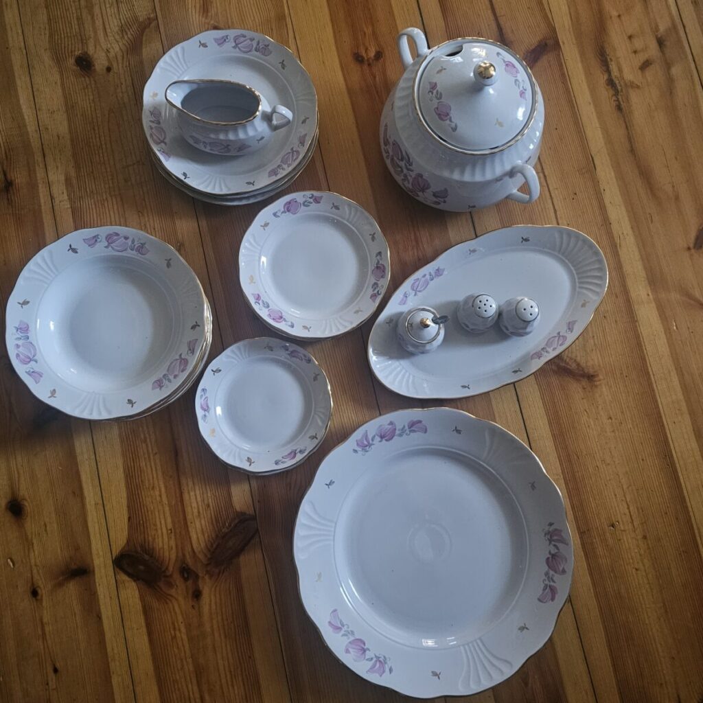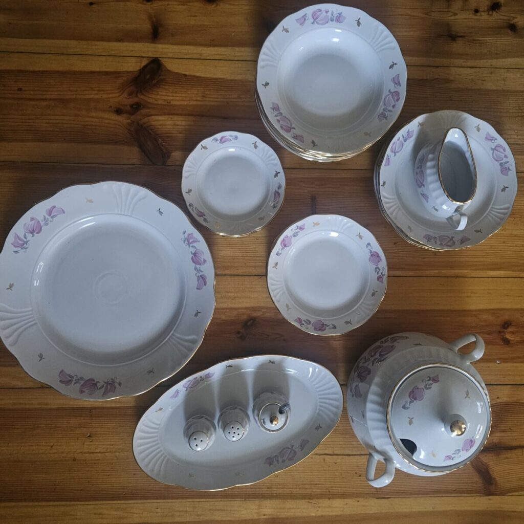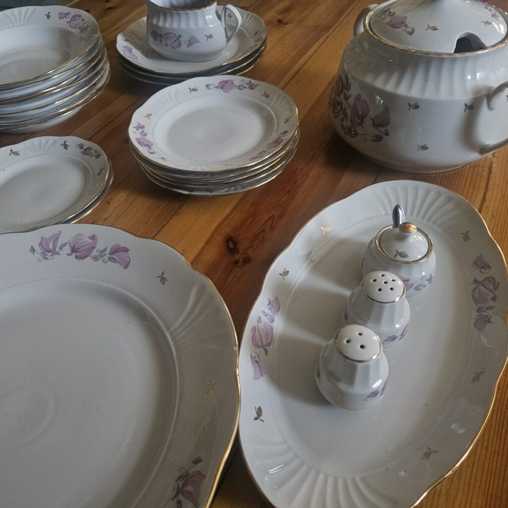 Valge portselan kuldse servaga ja õrnade roosakaslillade õiemotiividega – ajatu ilu, mis toob iga laua ellu nostalgilist soojust ja elegantsi.