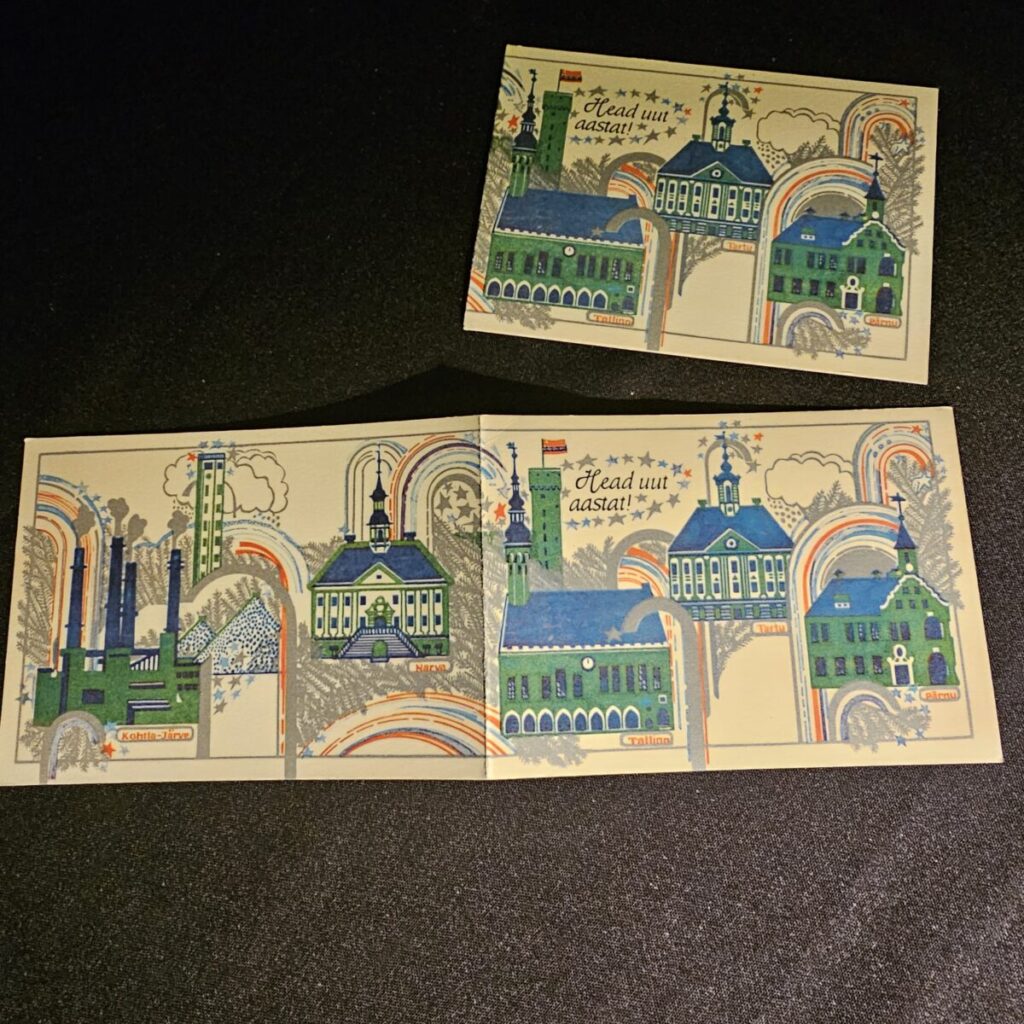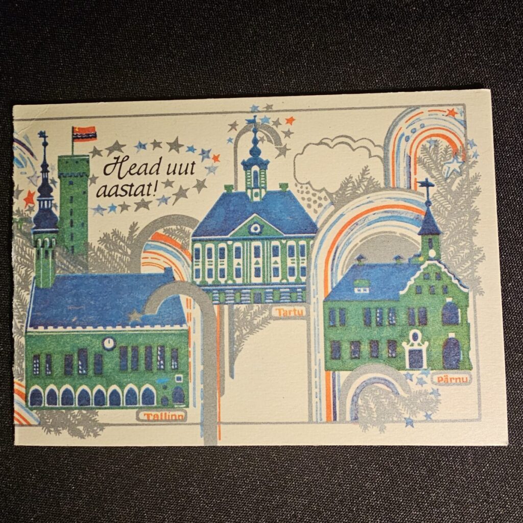 Värviküllane aastavahetuse postkaart, kujutamas Tallinna, Tartut, Pärnut, Narvat ja Kohtla-Järvet vikerkaarte ja tähti täis taeva all.
