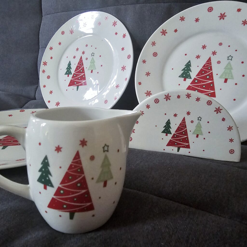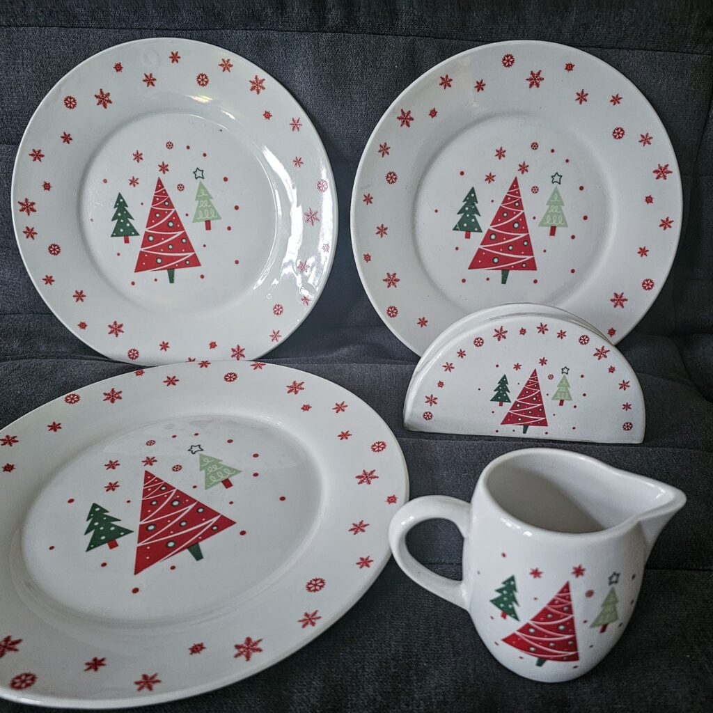 Komplekt koosneb: kolmest taldrikust, ühest salvrätihoidjast, ühest koorekannust