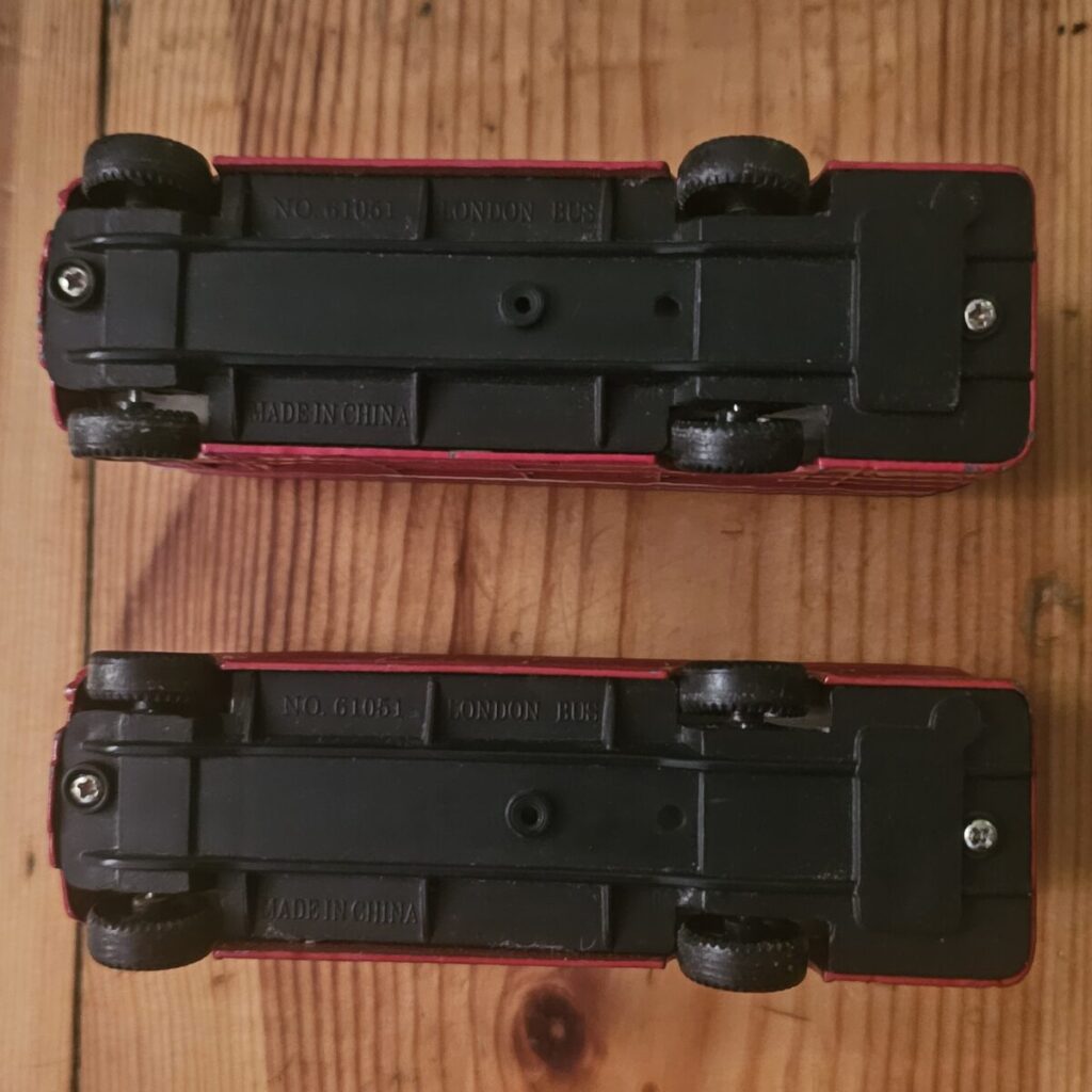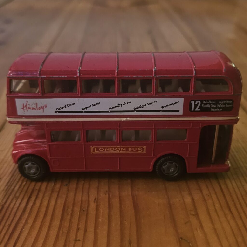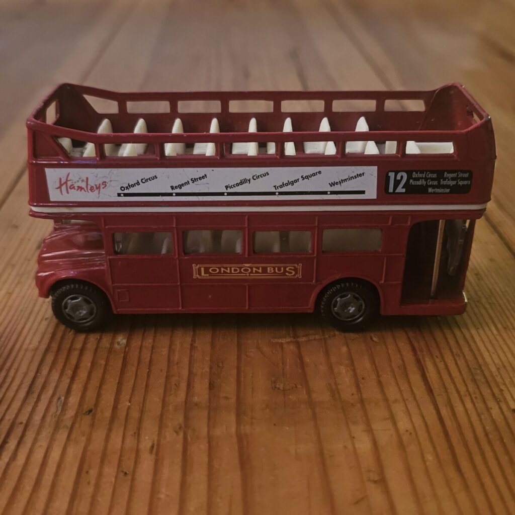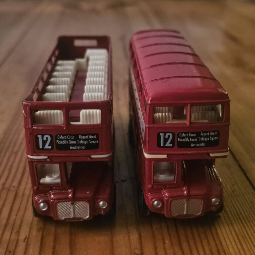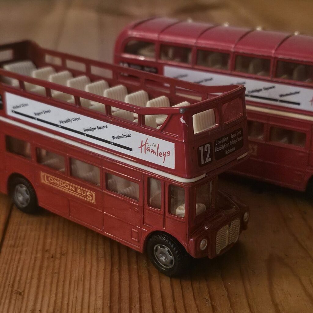 Klassikalised punased Hamleys “London Bus” mudelid – üks kinnise ja teine avatud katusega versioon.