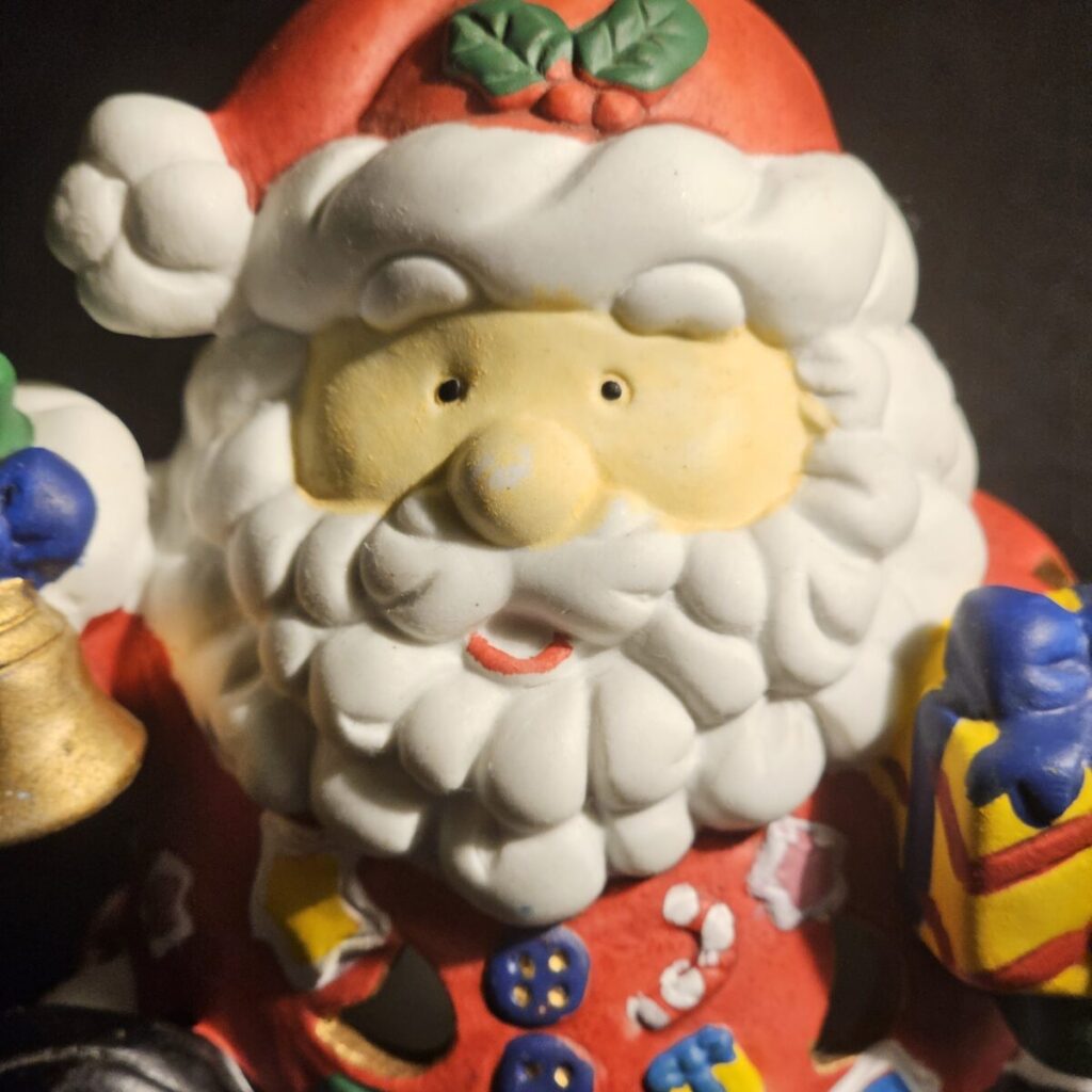 Armas ja detailirohke värvitud jõuluvana, mis hoiab kingitust ja kellukest.