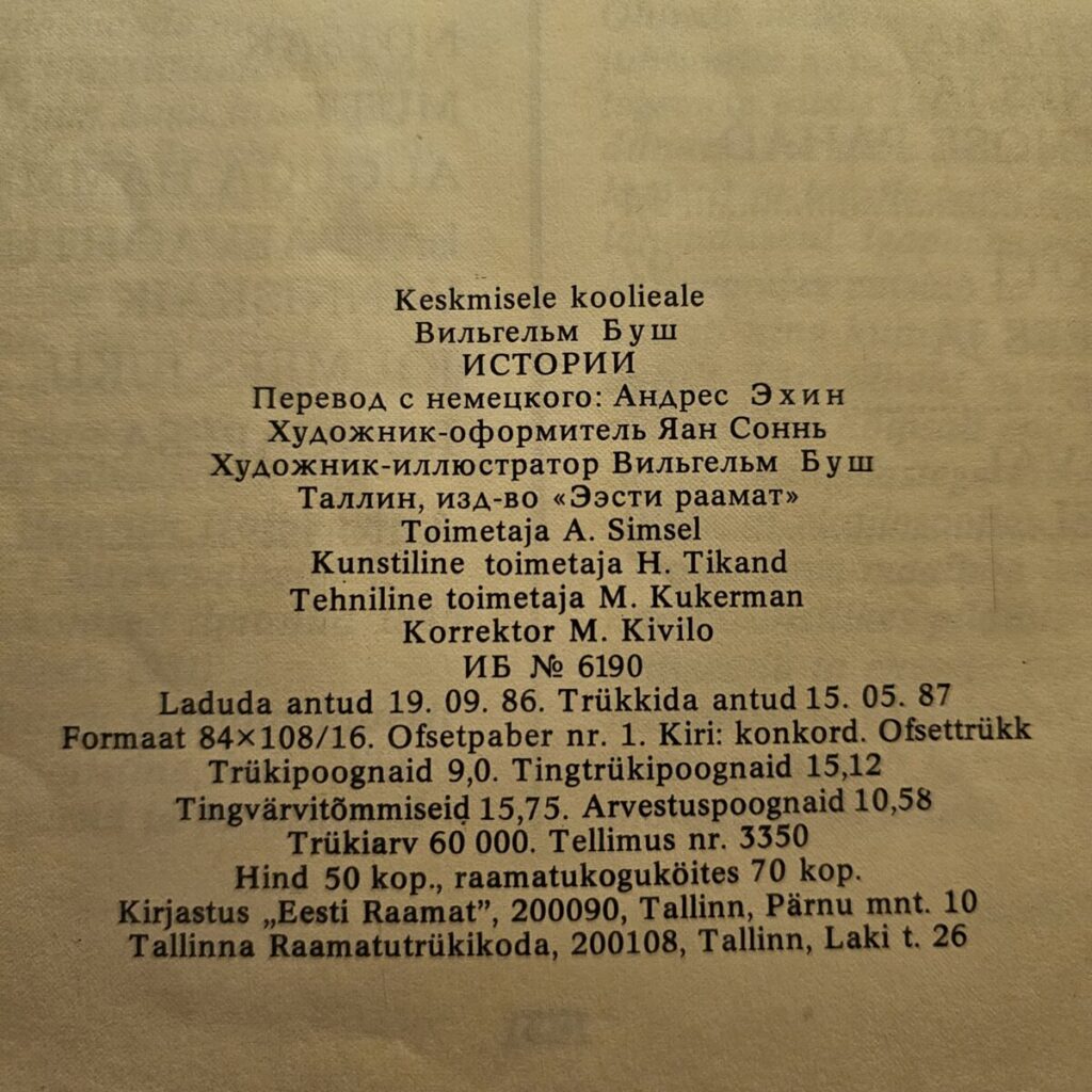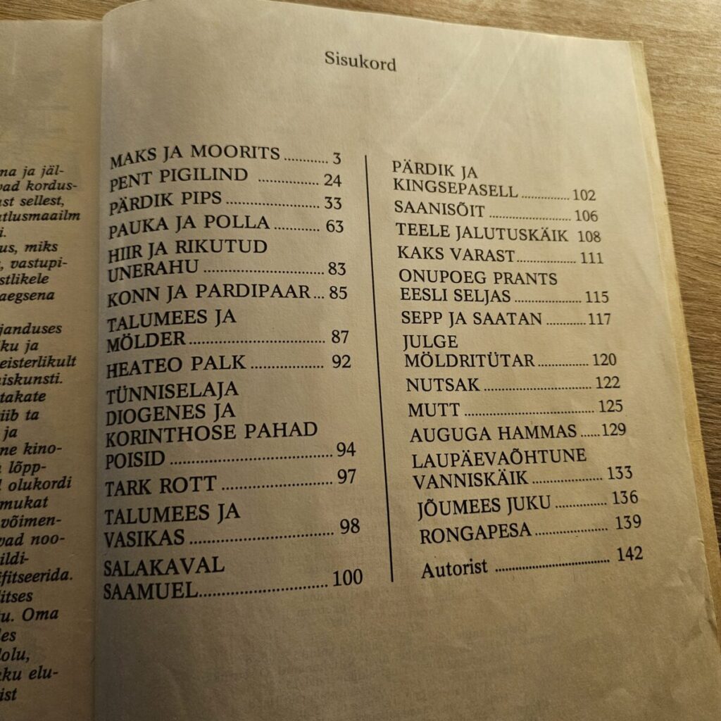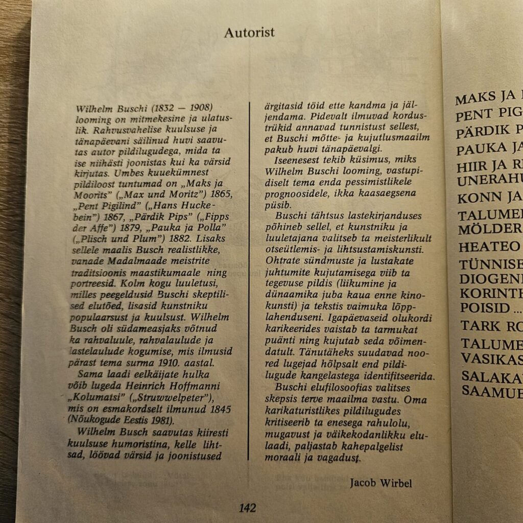 Saksa huumori ja koomiksi suurkuju Wilhelm Buschi klassikalised värsslugusid – “Maks ja Moorits”, “Pauk ja Polla”, “Pent Pigilind” jpt.