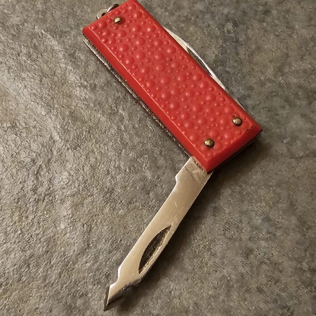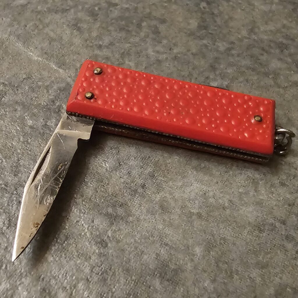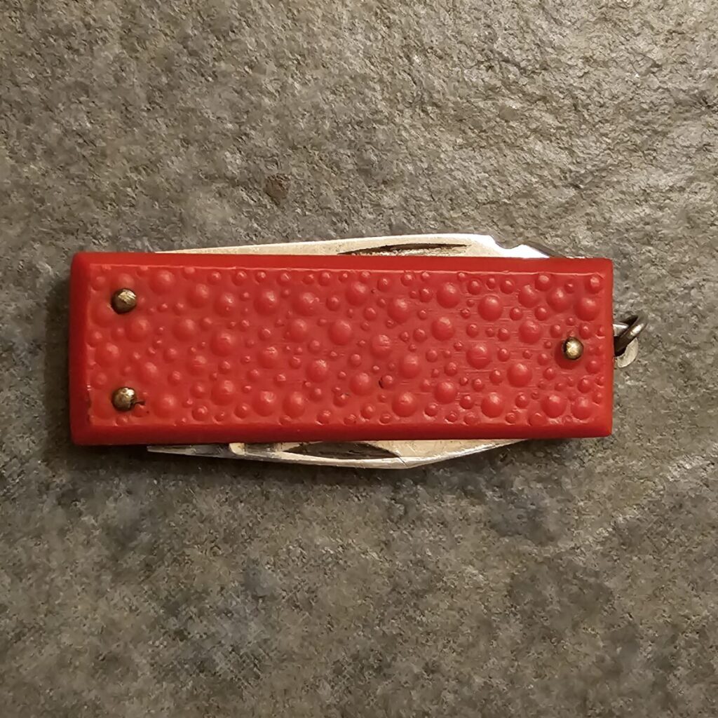 Punase reljeefse käepidemega mini-nuga, pikkus vaid 4,5 cm suletuna – sobib võtmehoidjale või kollektsiooni.