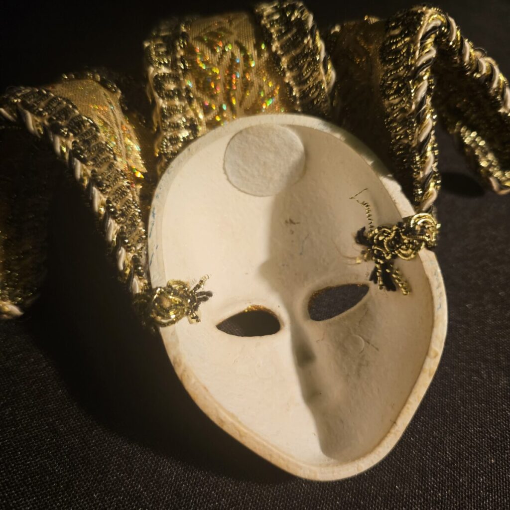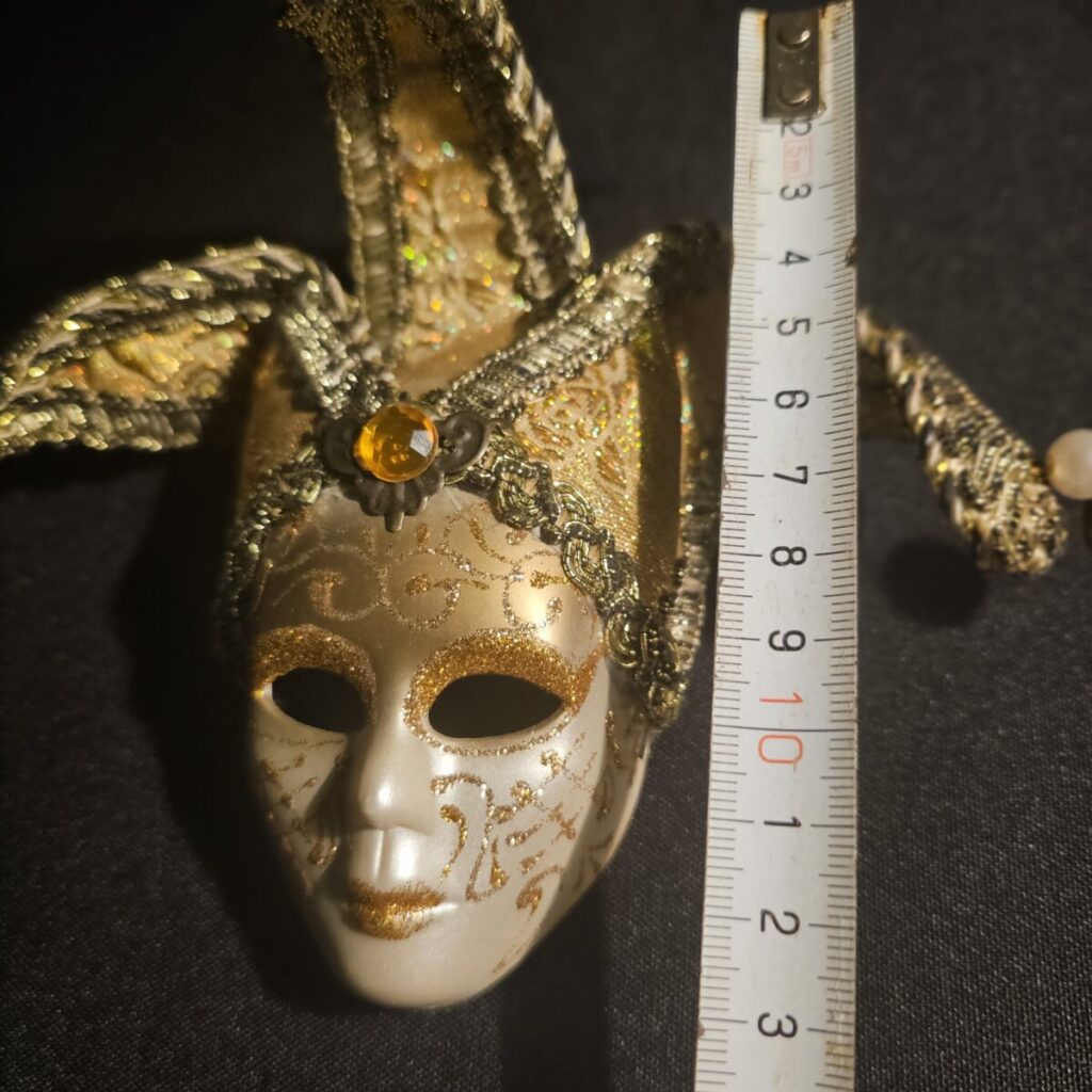 Dekoreeritud mask kullasära, helmeste ja kellukestega — justkui otse Veneetsia maskiballilt.