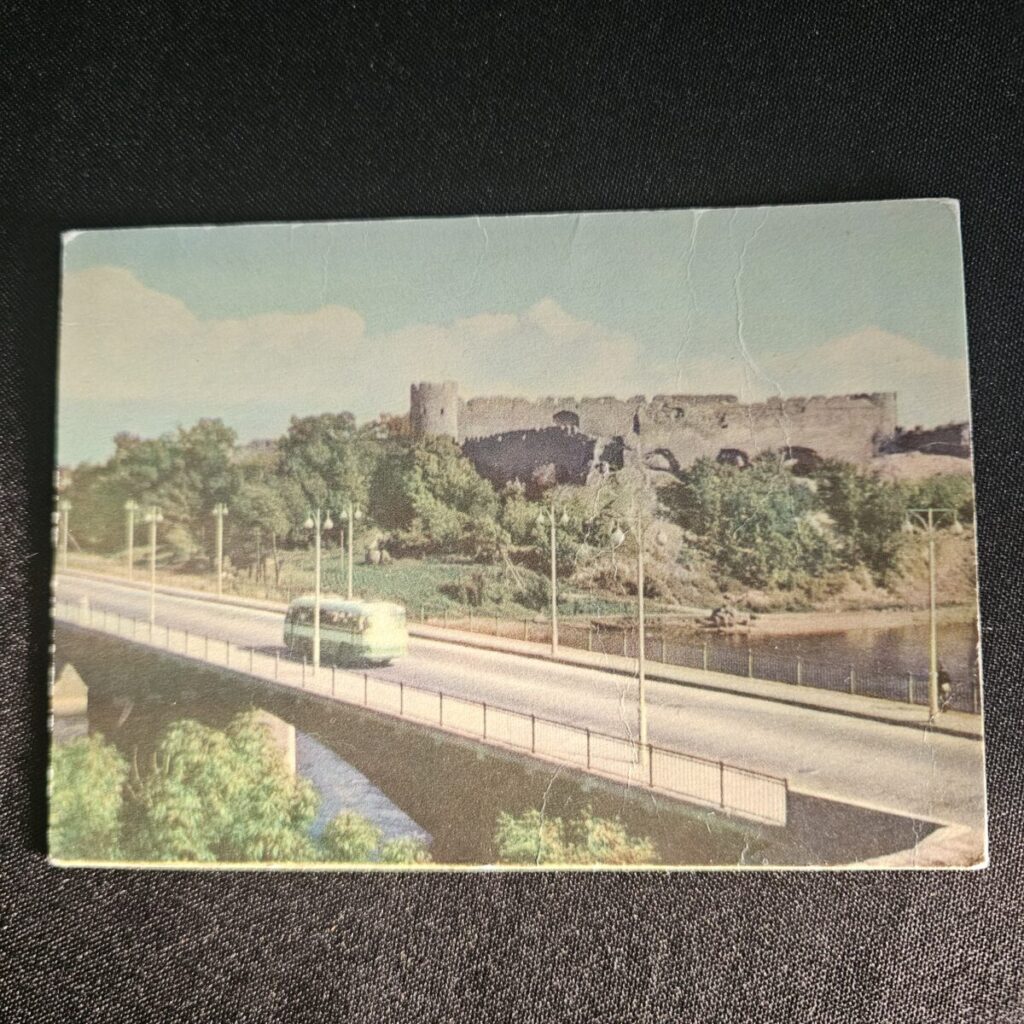 Autentne värviline postkaart ajast, mil üle Narva jõe Sõpruse silla sõitis veel roheline Nõukogude buss ja kindlusemüürid heitsid varju Eesti piirilinna peale.