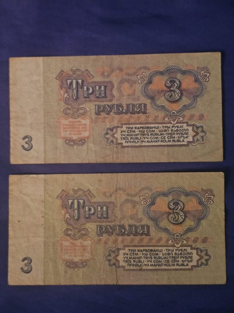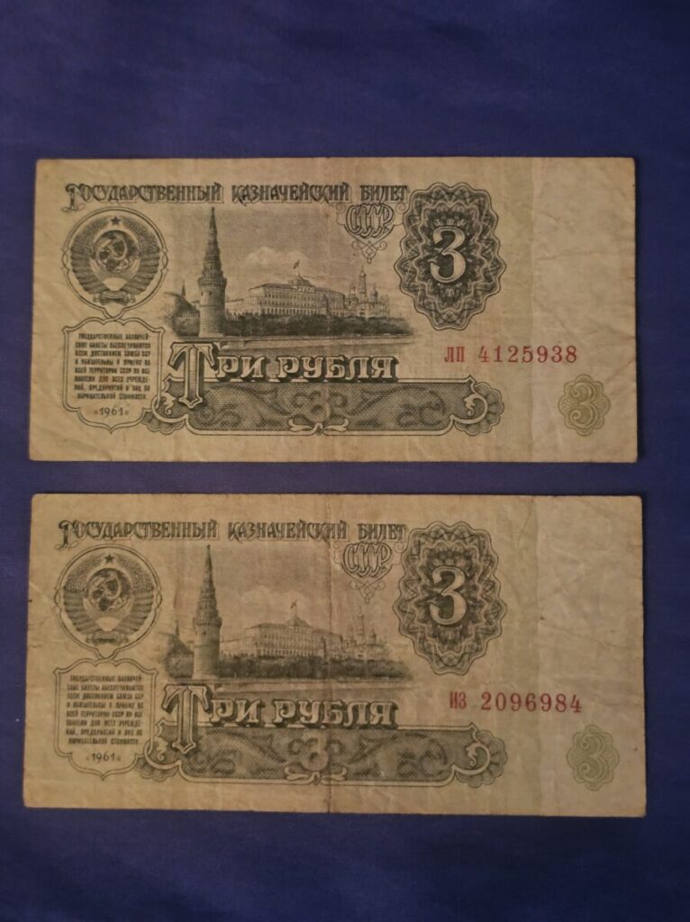 Originaalsed Nõukogude Liidu 3 rubla rahatähed aastast 1961, kujutamas Moskva Kremlit ja Spasski torni.