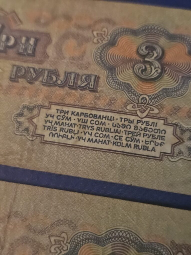 Tagaküljel on väärtus kirjutatud 15 liiduvabariigi keeles, sealhulgas ka eesti keeles “KOLM RUBLA”.
