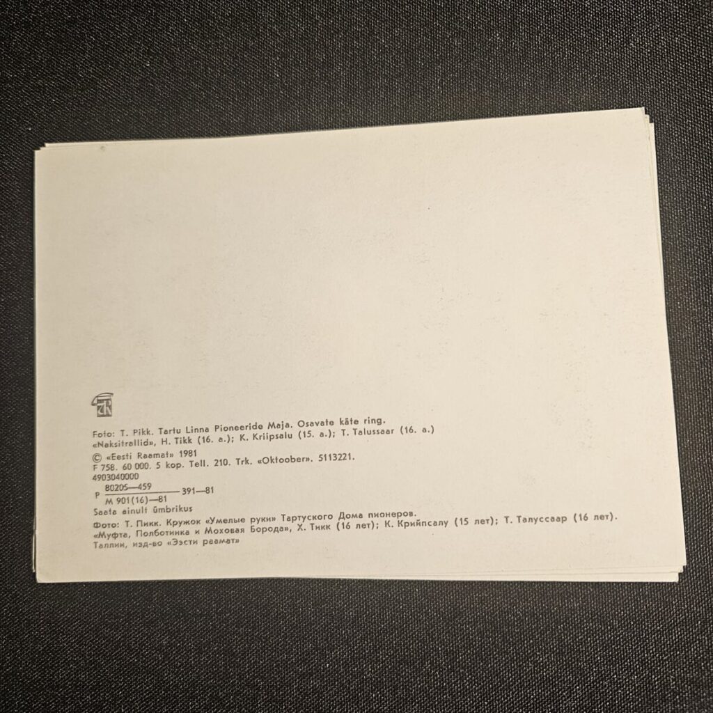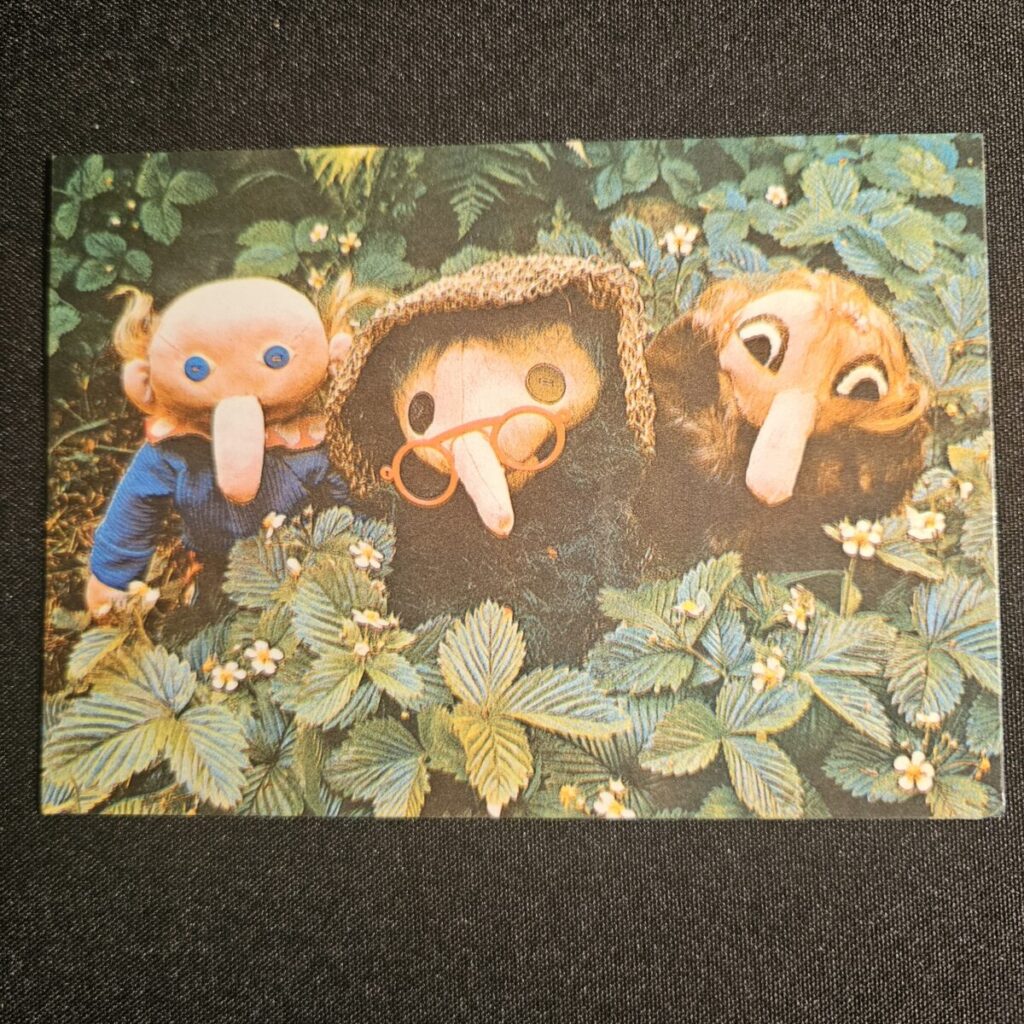 Võluv ja haruldane ENSV-aegne postkaart, millel on Tartu koolinoorte valmistatud käsitöönukud — Muhv, Kingpool ja Sammalhabe.