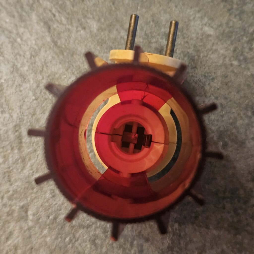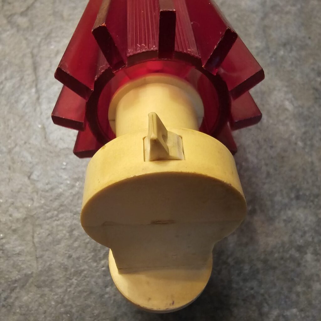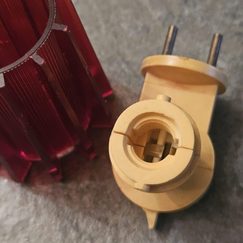 Hubase punase valgusega lamp – sobib hästi kollektsiooni, lavakujundusse, retrointerjööri dekoratsiooniks või rekvisiidiks filmidesse ja teatritesse.