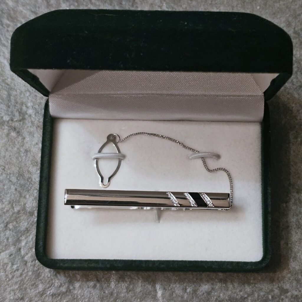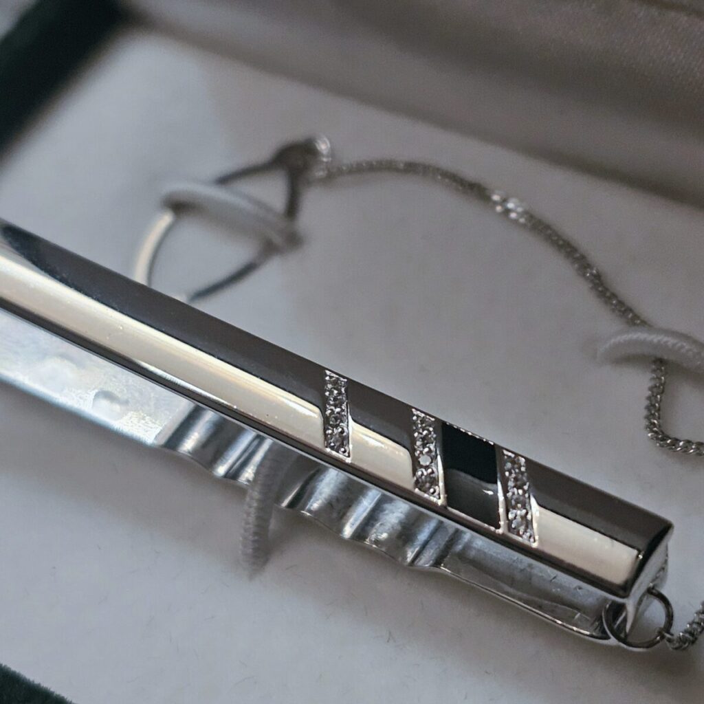 Klassikaline meeste lipsunõel 925 prooviga hõbedast, kaunistatud musta emaili ja väikeste sädelevate tsirkoonidega.