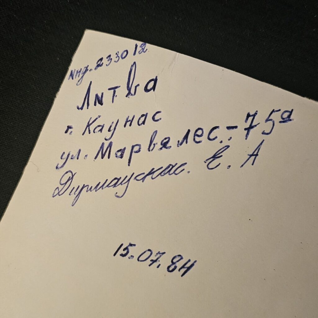 Tagaküljele on kirjutatud: Kaunas, Marvele tn 75a, J. Diumauskas – ehe ja isiklik mälestus ühest suvest Leedus.