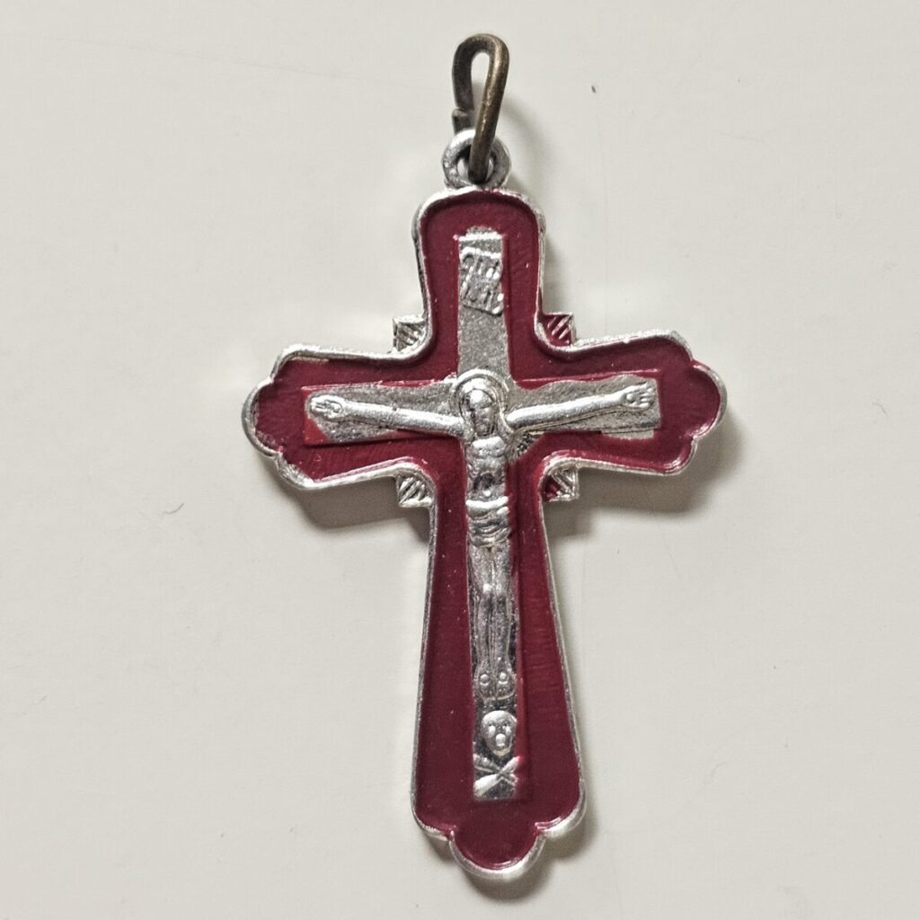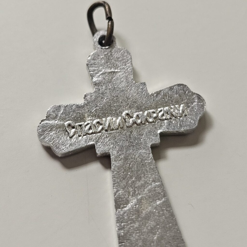 Autentne ja ajalooline metallist õigeusu rist, punase emailiviimistluse ja reljeefse Kristuse kujutisega.