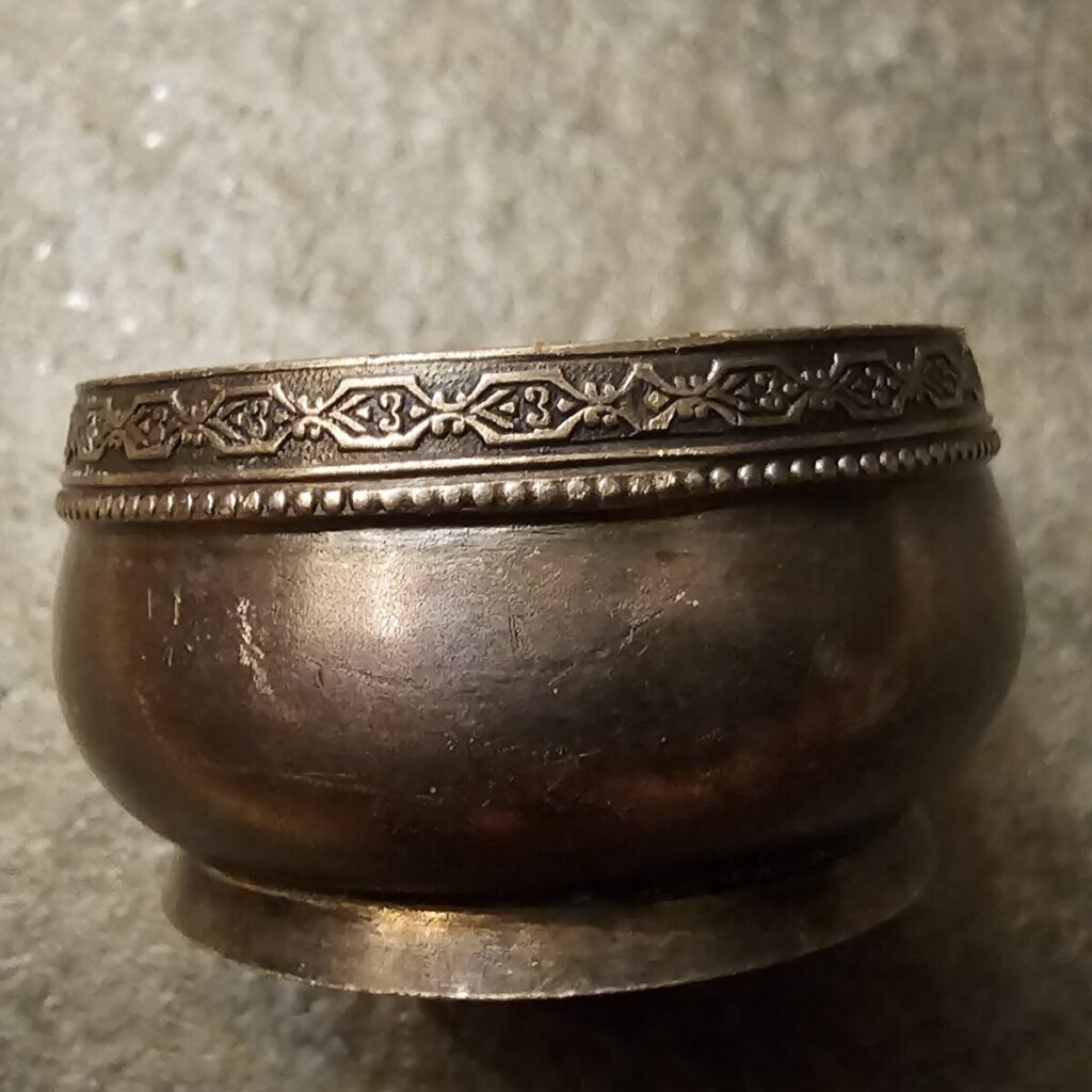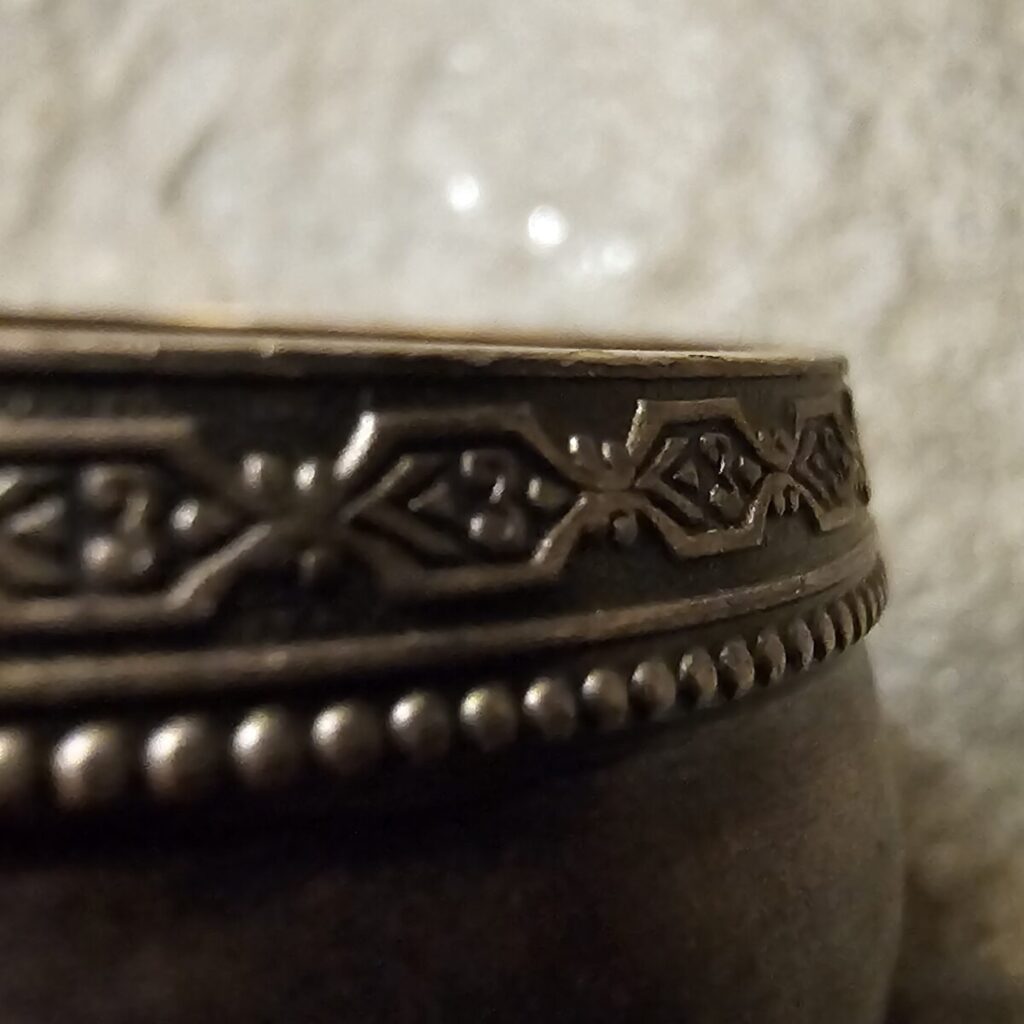 Peene mustriga ääris ja väärikas patina annavad esemele erilise ajaloolise ilme.