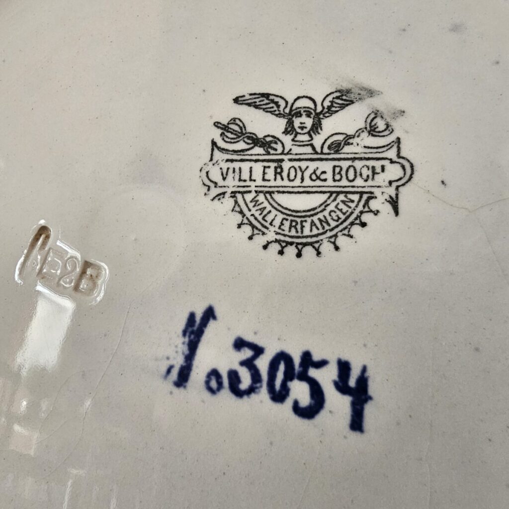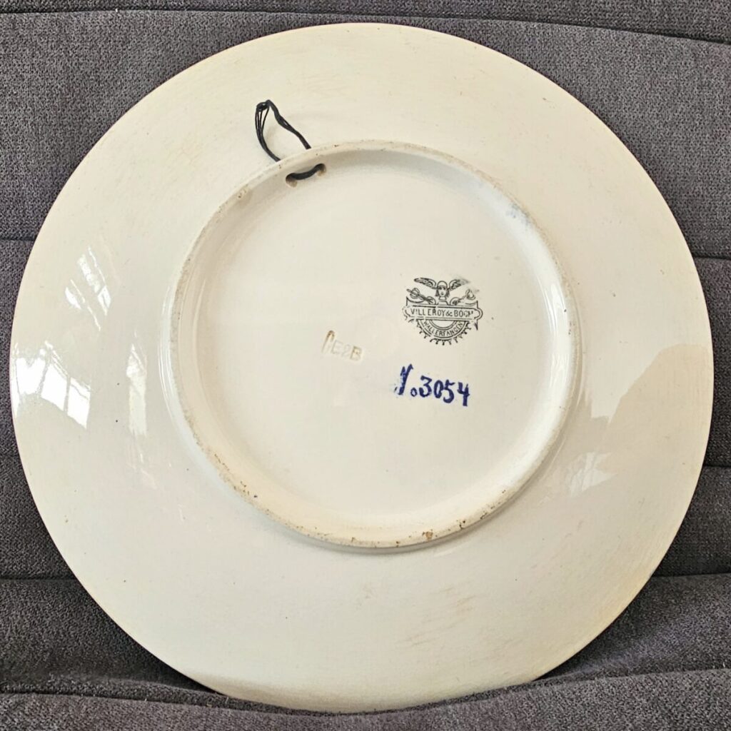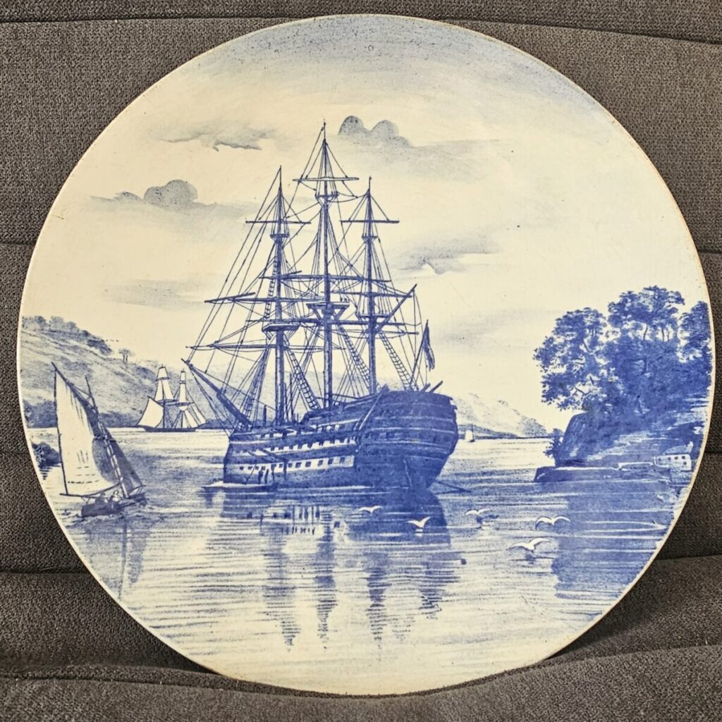Kaunis sinivalge dekoratiivplaat kujutab detailset purjelaeva merel. Klassikaline Delfti stiilis maaling Villeroy & Boch Wallerfangen tehase toodangust (Saksamaa, 19.–20. sajandi vahetus).